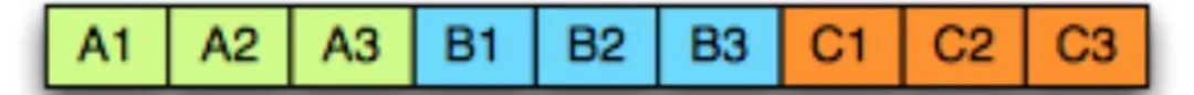 在面向行的存储中,每列的数据依次排成一行,如下所示: