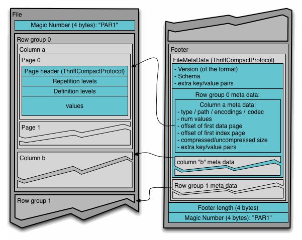 4-byte magic number "PAR1"............File Metadata4-byte length in bytes of file metadata4-byte magic number "PAR1"