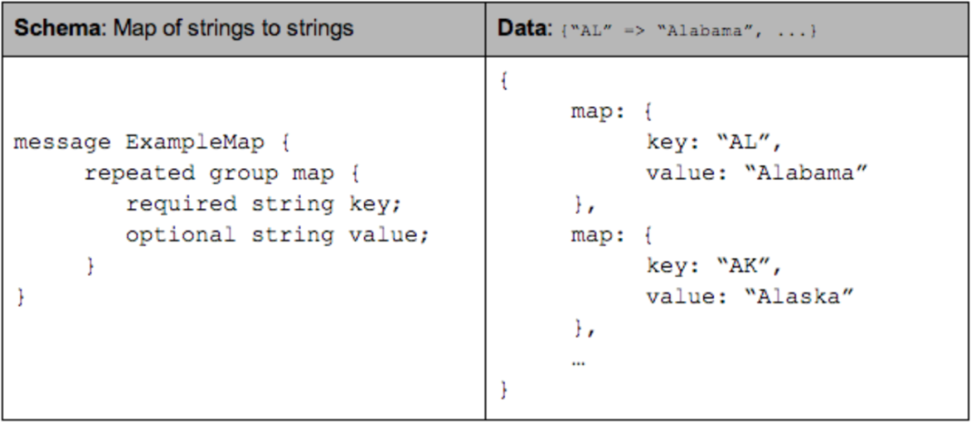 采用 repeated group(包含 key 和 value,其中 key 是 required) 来表达 Map 的示例: