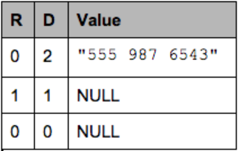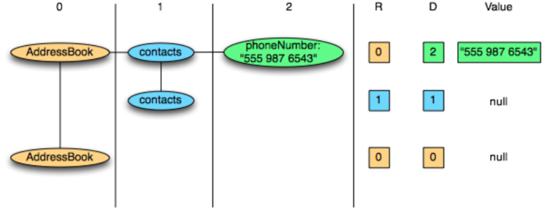 contacts.phoneNumber: “555 987 6543”new record: R = 0value is defined: D = maximum (2)contacts.phoneNumber: nullrepeated contacts: R = 1only defined up to contacts: D = 1contacts: nullnew record: R = 0only defined up to AddressBook: D = 0