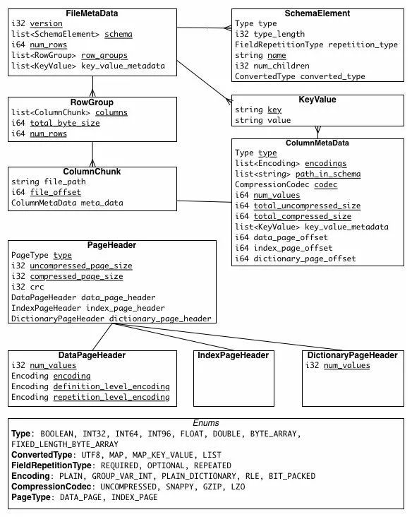 Parquet 总共有 3 种类型的元数据:文件元数据、列(块)元数据和 page header 元数据。所有元数据都采用 thrift 协议存储。具体信息如下所示: