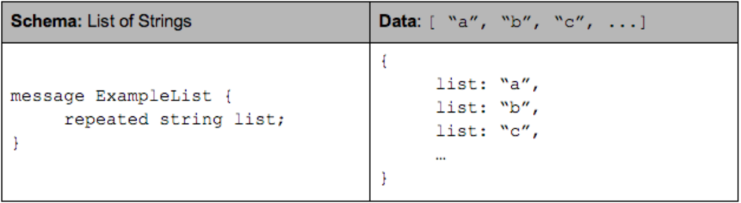 这个模型非常的简洁。一些复杂的数据类型如:Map/List/Set 也可以用重复的字段(repeated fields) + groups 来表达,因此也就不用再单独定义这些类型。
