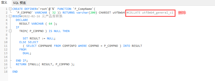 - 检查函数过程,取消过程中的 COLLATE 关键字。