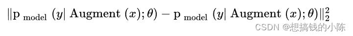 自洽正则化:以前遇到标记数据太少,监督学习泛化能力差的时候,人们一般进行训练数据增广,比如对图像做随机平移,缩放,旋转,扭曲,剪切,改变亮度,饱和度,加噪声等。数据增广能产生无数的修改过的新图像,扩大训练数据集。自洽正则化的思路是,对未标记数据进行数据增广,产生的新数据输入分类器,预测结果应保持自洽。即同一个数据增广产生的样本,模型预测结果应保持一致。此规则被加入到损失函数中,有如下形式,