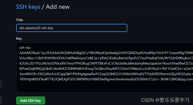 然后在Key那栏下面将id_rsa.pub粘贴进去就可以了,最后点击 Add SSH key按钮添加