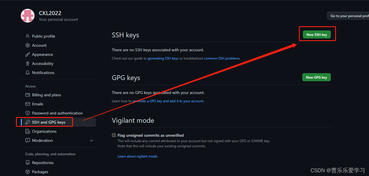 拷贝这堆字符串:进入你自己的github,进入Settings->SSHand GPG keys->New SSH key