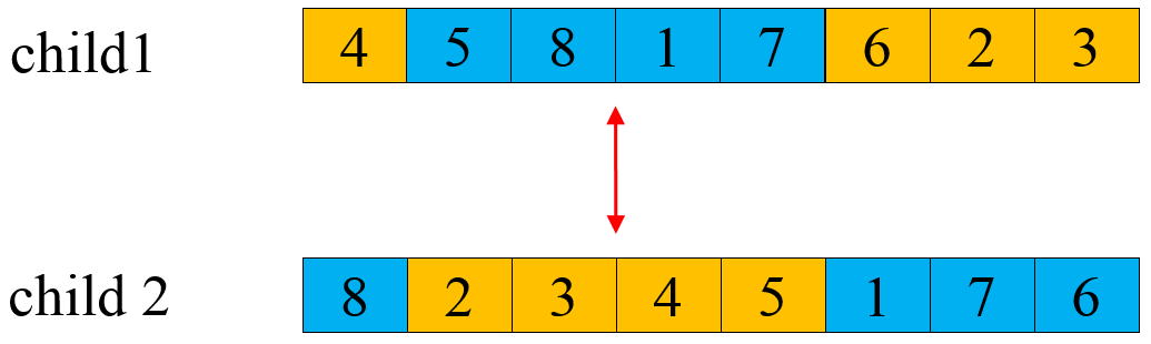 - 重复基因替换。对非交叉的基因片段进行扫描,若发现重复基因,则根据step3建立的映射表进行替换。保证了每个染色体中的基因仅出现一次,通过该交叉策略在一个染色体中不会出现重复的基因,所以经常用于旅行商(TSP)或其他排序问题编码。