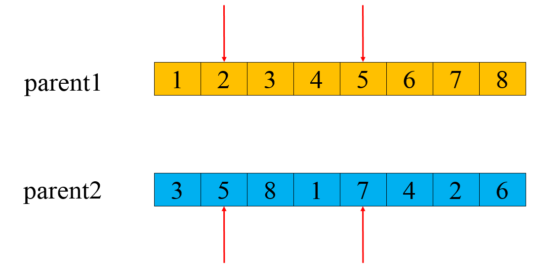 - 随机选择两条染色体作为父代染色体,随机选择交叉基因的起止位置(两染色体被选位置相同)。