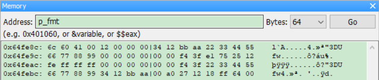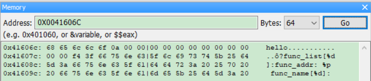 在右侧的ascii码表示中出现了hello, 就是传入的那个字符串. 可以看到传入的参数有规律, 按照顺序和该类型占用的字节数保存在一段连续的内存中.