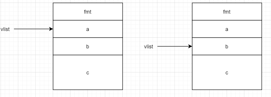 static void * vlist; // 定义一个指针 my_va_start(vlist, fmt); // 指向省略号...中的第一个参数的地址