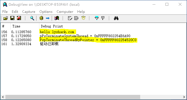 {DbgPrint("hello lyshark.com \n");PVOID address = PspTerminateThreadByPointer();DbgPrint("PspTerminateThreadByPointer = 0x%p \n", address);Driver->DriverUnload = UnDriver;return STATUS_SUCCESS;