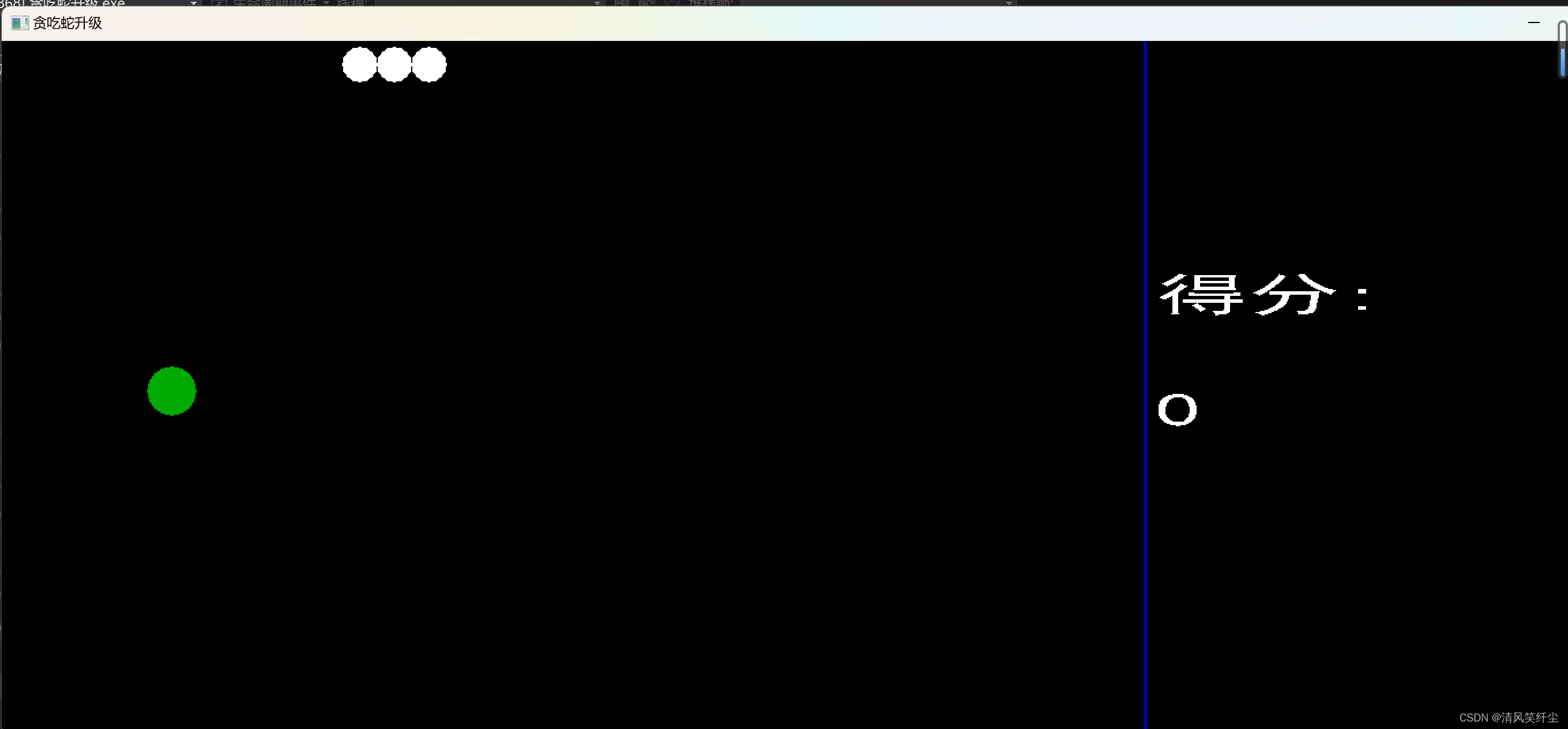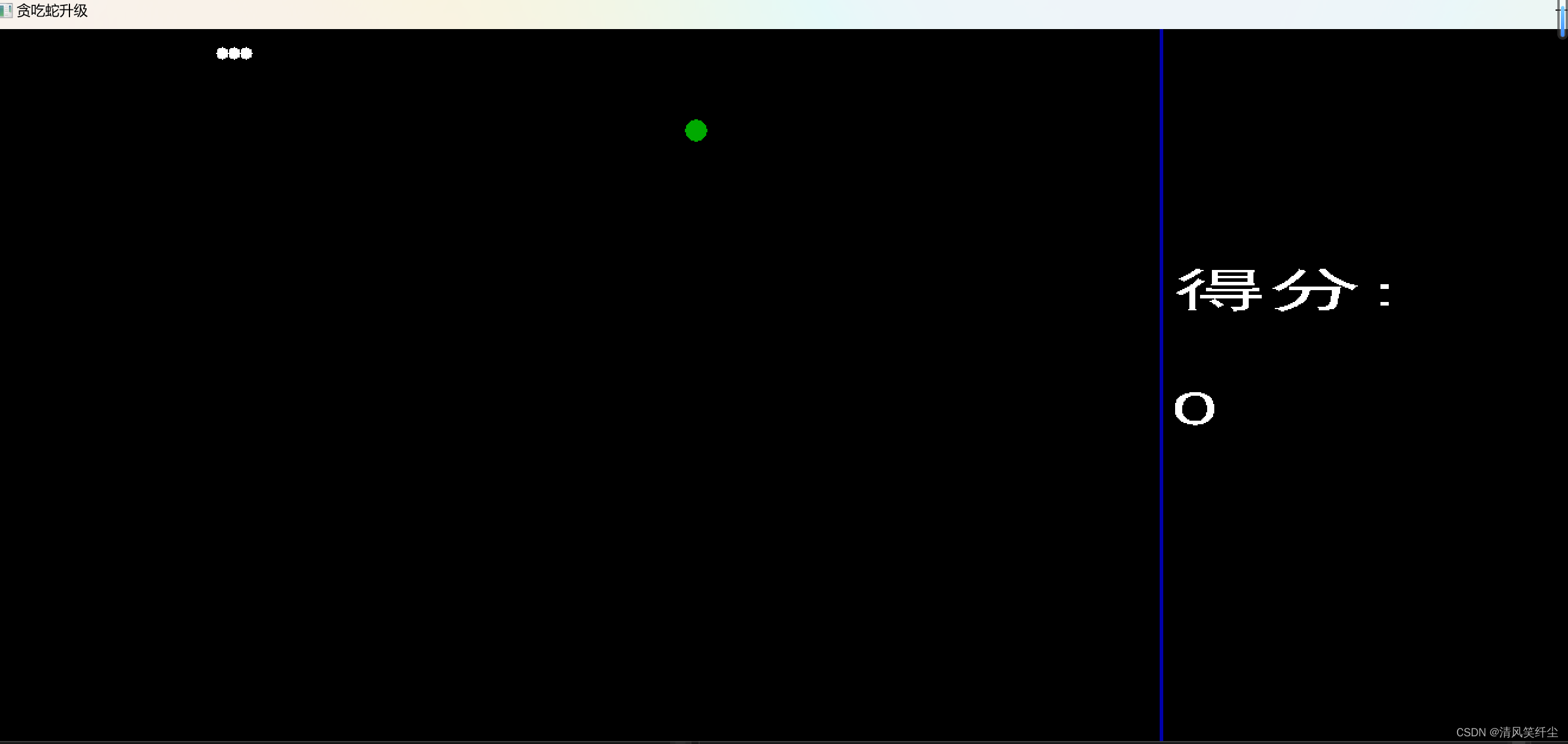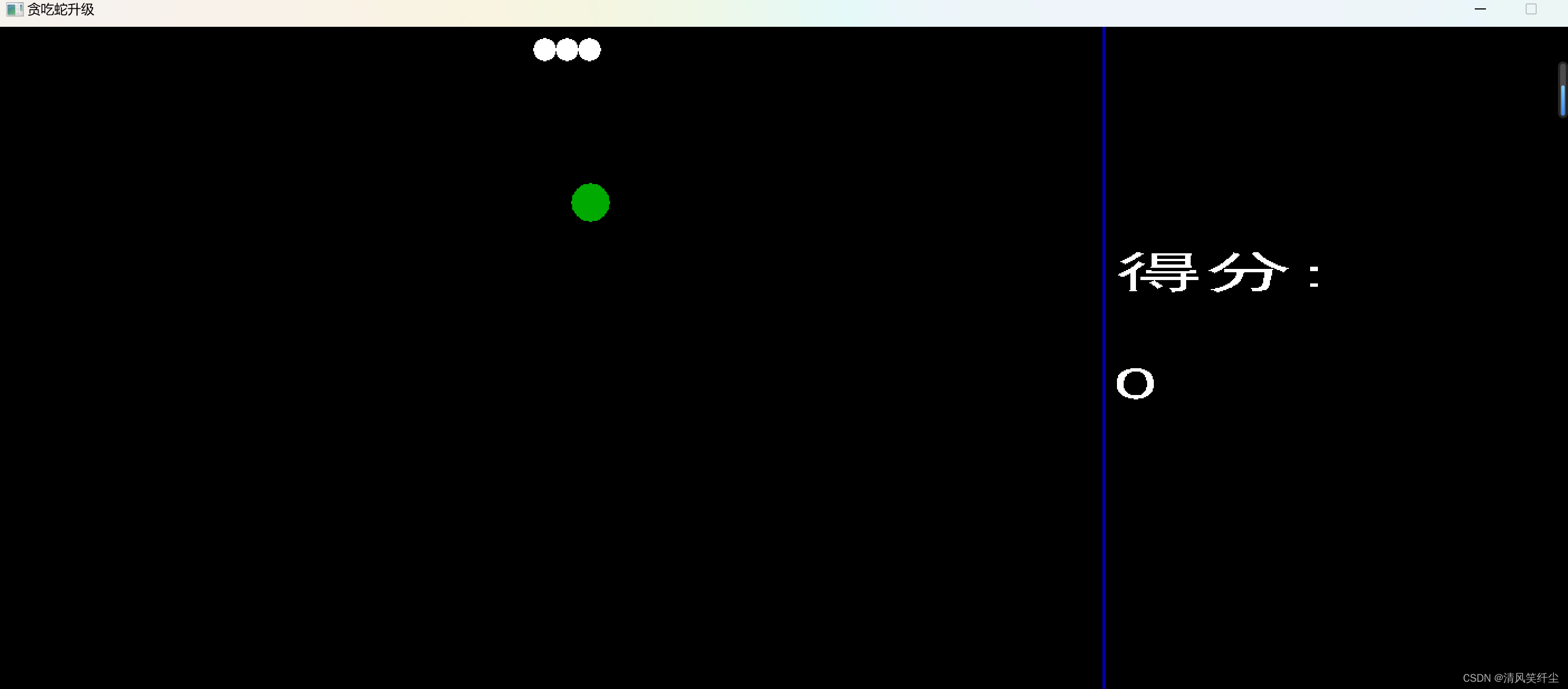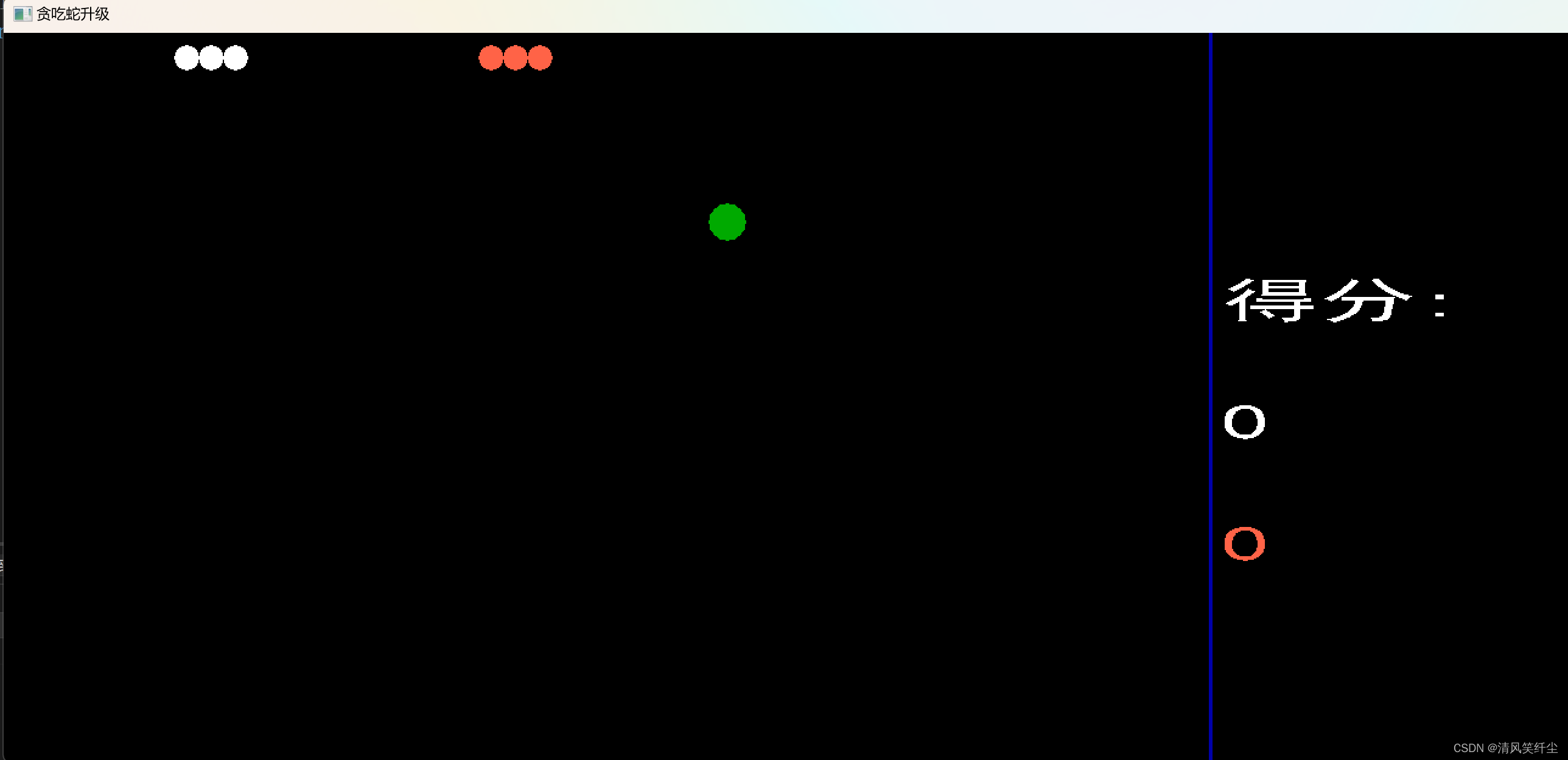 {char num[100]; char mun[100];int n = snake1.score; int m = snake2.score;BeginBatchDraw();//双缓冲setbkcolor(BLACK);cleardevice();if (a == 4){setfillcolor(RGB(255,99,71));for (int i = 0; i < snake2.size; i++){solidcircle(snake2.section[i].x, snake2.section[i].y, snake2.r);}settextcolor(RGB(255, 99, 71));settextstyle(40, 40, "黑体");sprintf(mun, "%d", m);outtextxy(1000, 400, mun);}setfillcolor(WHITE);for (int i = 0; i < snake1.size; i++){solidcircle(snake1.section[i].x, snake1.section[i].y, snake1.r);}setfillcolor(GREEN);if (food.flag){solidcircle(food.x, food.y, food.r);}for (int i = 0; i < 30; i++){settextcolor(BLUE);settextstyle(20, 20, "黑体");outtextxy(982, i * 20, "|");}settextcolor(WHITE);settextstyle(40, 40, "黑体");outtextxy(1000, 200, "得分:");sprintf(num, "%d", n);outtextxy(1000, 300, num);EndBatchDraw();