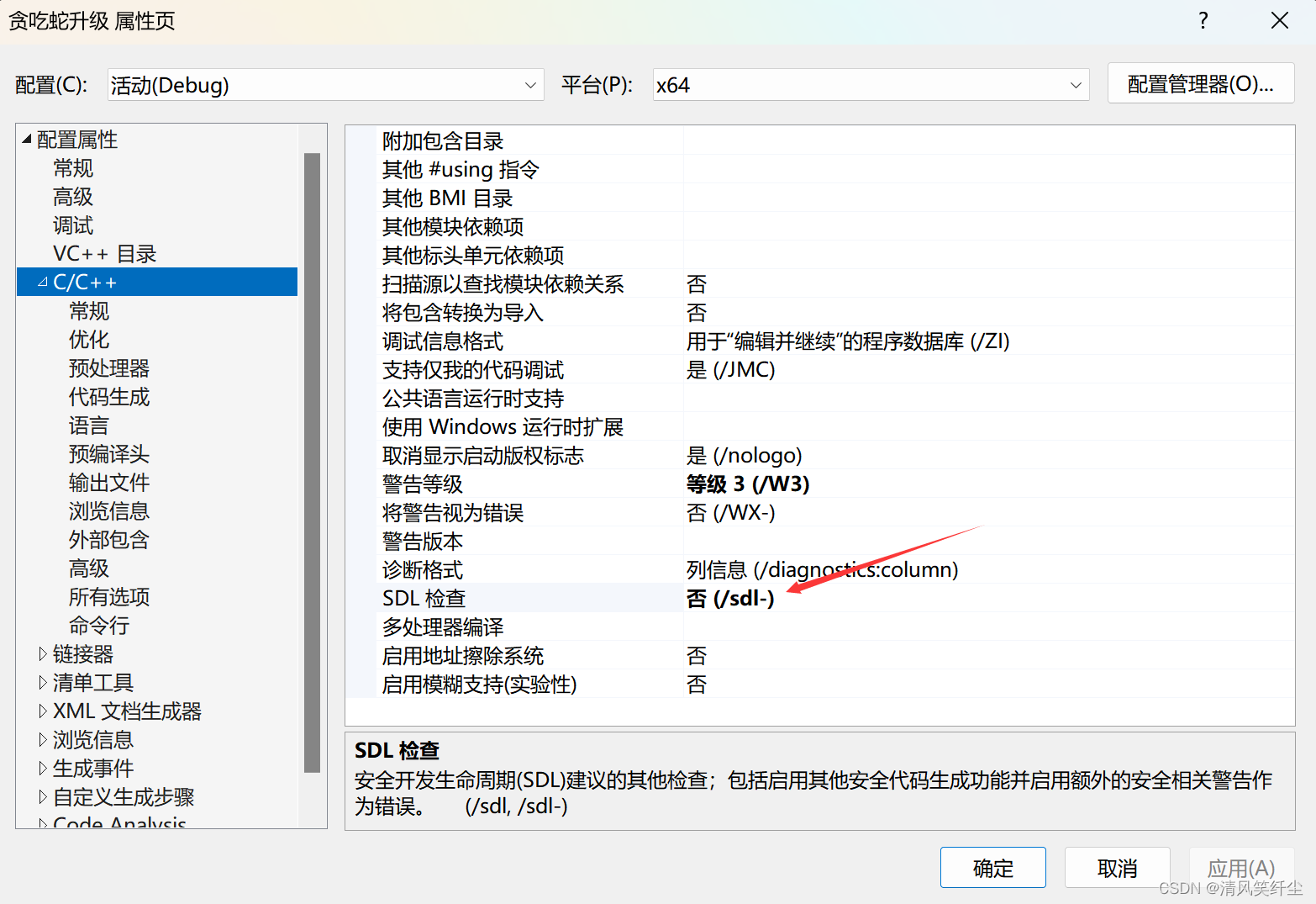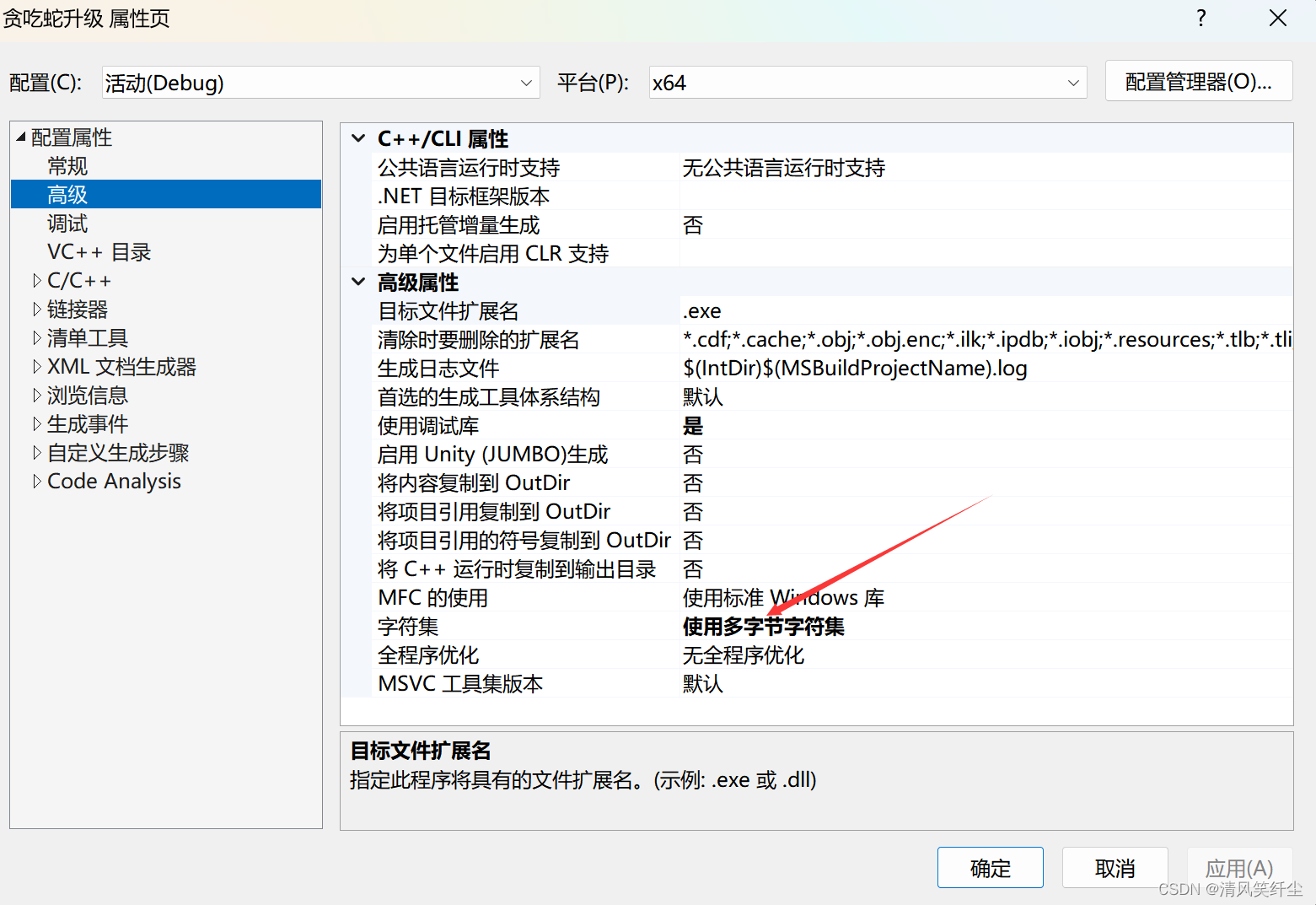 然后将SDL检查改为否,并且将字符集改为使用多字节字符集: