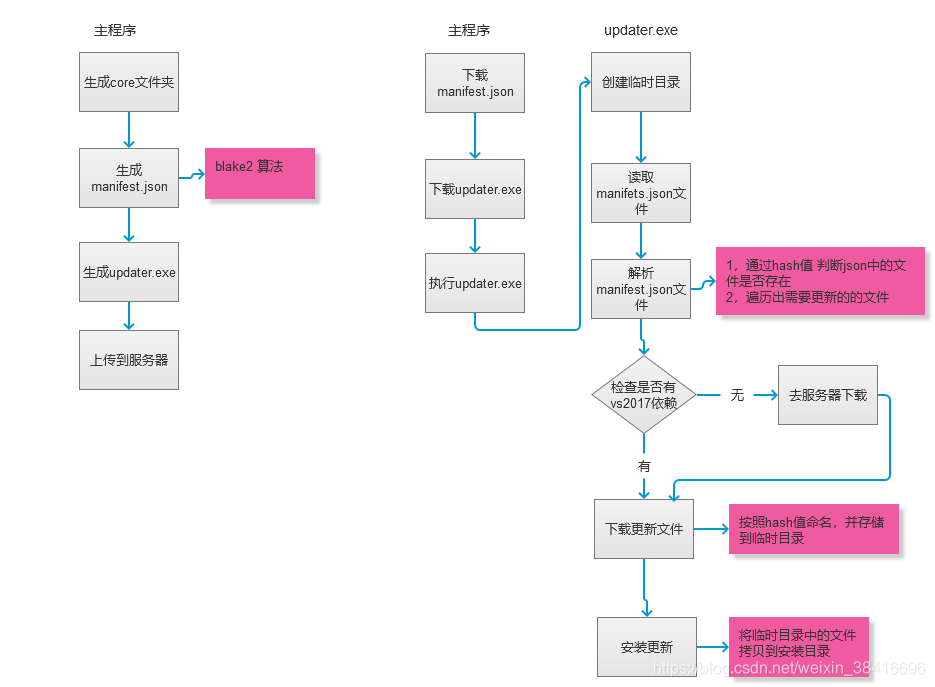 try {long responseCode;vector extraHeaders;string text;string error;string signature;CryptProvider localProvider;BYTE manifestHash[BLAKE2_HASH_LENGTH];bool updatesAvailable = false;bool success;struct FinishedTrigger {inline ~FinishedTrigger(){QMetaObject::invokeMethod(App()->GetMainWindow(),"updateCheckFinished"); }} finishedTrigger;BPtr manifestPath = GetConfigPathPtr("obs-studio\\updates\\manifest.json");auto ActiveOrGameCaptureLocked = [this] (){if (obs_video_active()) {if (manualUpdate)info(QTStr("Updater.Running.Title"),QTStr("Updater.Running.Text"));return true;}if (IsGameCaptureInUse()) {if (manualUpdate)info(QTStr("Updater.GameCaptureActive.Title"),QTStr("Updater.GameCaptureActive.Text"));return true;}return false;};/* ----------------------------------- ** warn if running or gc locked */if (ActiveOrGameCaptureLocked())return;/* ----------------------------------- ** create signature provider */if (!CryptAcquireContext(&localProvider,nullptr,MS_ENH_RSA_AES_PROV,PROV_RSA_AES,CRYPT_VERIFYCONTEXT))throw strprintf("CryptAcquireContext failed: %lu",GetLastError());provider = localProvider;/* ----------------------------------- ** avoid downloading manifest again */if (CalculateFileHash(manifestPath, manifestHash)) {char hashString[BLAKE2_HASH_STR_LENGTH];HashToString(manifestHash, hashString);string header = "If-None-Match: ";header += hashString;extraHeaders.push_back(move(header));}/* ----------------------------------- ** get current install GUID */string guid = GetProgramGUID();if (!guid.empty()) {string header = "X-OBS2-GUID: ";header += guid;extraHeaders.push_back(move(header));}/**************************************************************************/success = GetRemoteFileFromAliyun("updates/config/manifest.json", manifestPath);/* ----------------------------------- ** get manifest from server *///success = GetRemoteFile(WIN_MANIFEST_URL, text, error, &responseCode,/* nullptr, nullptr, extraHeaders, &signature);if (!success || (responseCode != 200 && responseCode != 304)) {if (responseCode == 404)return;throw strprintf("Failed to fetch manifest file: %s", error.c_str());}*//* ----------------------------------- ** verify file signature *//* a new file must be digitally signed 校验数字签名 *//*if (responseCode == 200) {success = CheckDataSignature(text, "manifest",signature.data(), signature.size());if (!success)throw string("Invalid manifest signature");}*//**************************************************************************//* ----------------------------------- ** write or load manifest 读取mainfest文件 */ //if (/*responseCode == 200*/success) {// if (!QuickWriteFile(manifestPath, text.data(), text.size()))// throw strprintf("Could not write file '%s'",// manifestPath.Get());//} else {if (!QuickReadFile(manifestPath, text))throw strprintf("Could not read file '%s'",manifestPath.Get());//}/* ----------------------------------- ** check manifest for update */string notes;int updateVer = 0;success = ParseUpdateManifest(text.c_str(), &updatesAvailable, notes,updateVer);//比对版本 判断是否更新if (!success)throw string("Failed to parse manifest");if (!updatesAvailable) {//if (manualUpdate)// info(QTStr("Updater.NoUpdatesAvailable.Title"),// QTStr("Updater.NoUpdatesAvailable.Text"));return;}/* ----------------------------------- ** skip this version if set to skip */int skipUpdateVer = config_get_int(GetGlobalConfig(), "General","SkipUpdateVersion");if (!manualUpdate && updateVer == skipUpdateVer)return;/* ----------------------------------- ** warn again if running or gc locked */if (ActiveOrGameCaptureLocked())return;/* ----------------------------------- ** fetch updater module 获取updater.exe *///if (!FetchUpdaterModule(WIN_UPDATER_URL))// return;//qxlBPtr updateFilePath = GetConfigPathPtr("obs-studio\\updates\\libcurl.dll");if (!GetRemoteFileFromAliyun("updates/config/libcurl.dll", updateFilePath))return;updateFilePath = GetConfigPathPtr("obs-studio\\updates\\libeay32.dll");if (!GetRemoteFileFromAliyun("updates/config/libeay32.dll", updateFilePath))return;updateFilePath = GetConfigPathPtr("obs-studio\\updates\\ssleay32.dll");if (!GetRemoteFileFromAliyun("updates/config/ssleay32.dll", updateFilePath))return;updateFilePath = GetConfigPathPtr("obs-studio\\updates\\zlibwapi.dll");if (!GetRemoteFileFromAliyun("updates/config/zlibwapi.dll", updateFilePath))return;updateFilePath = GetConfigPathPtr("obs-studio\\updates\\updater.exe");if (!GetRemoteFileFromAliyun("updates/config/updater.exe", updateFilePath))return;/* ----------------------------------- ** query user for update *///不询问用户,直接下载更新/*int queryResult = queryUpdate(manualUpdate, notes.c_str());if (queryResult == OBSUpdate::No) {if (!manualUpdate) {long long t = (long long)time(nullptr);config_set_int(GetGlobalConfig(), "General","LastUpdateCheck", t);}return;} else if (queryResult == OBSUpdate::Skip) {config_set_int(GetGlobalConfig(), "General","SkipUpdateVersion", updateVer);return;}*//* ----------------------------------- ** get working dir */wchar_t cwd[MAX_PATH];GetModuleFileNameW(nullptr, cwd, _countof(cwd) - 1);wchar_t *p = wcsrchr(cwd, '\\');if (p)*p = 0;/* ----------------------------------- ** execute updater */ //确认对话框开始更新//qxl//BPtr updateFilePath = GetConfigPathPtr(//"obs-studio\\updates\\updater.exe");BPtr wUpdateFilePath;size_t size = os_utf8_to_wcs_ptr(updateFilePath, 0, &wUpdateFilePath);if (!size)throw string("Could not convert updateFilePath to wide");/* note, can't use CreateProcess to launch as admin. */SHELLEXECUTEINFO execInfo = {};execInfo.cbSize = sizeof(execInfo);execInfo.lpFile = wUpdateFilePath;