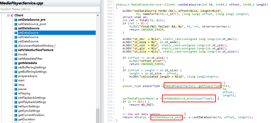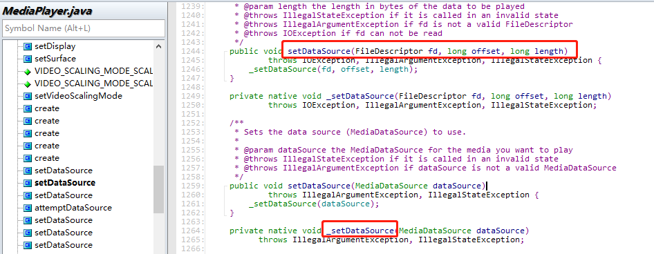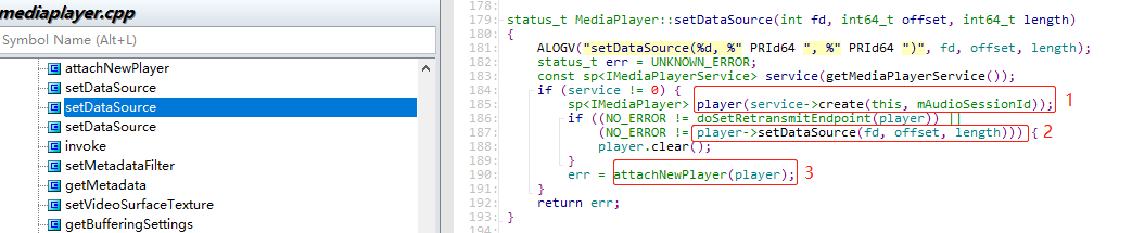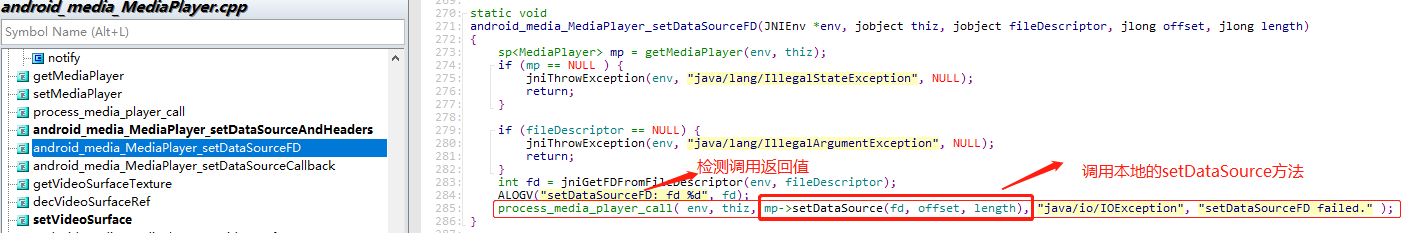 - 在android_media_MediaPlayer_setDataSourceFD中调用本地的setDataSource方法