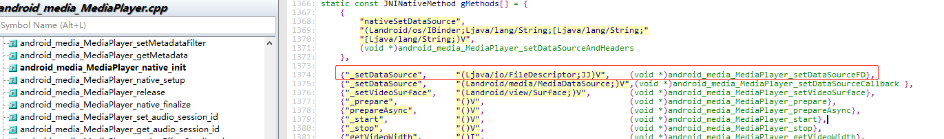 在JNI注册表中将_setDataSource方法映射成 android_media_MediaPlayer_setDataSourceFD方法