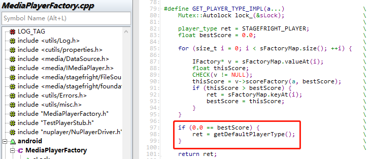 - 通过宏定义 GET_PLAYER_TYPE_IMPL获取播放器类型,sFactoryMap中的player类型通过一些比较算法取出来,我们使用getDefaultPlayerType 返回的类型进行分析。