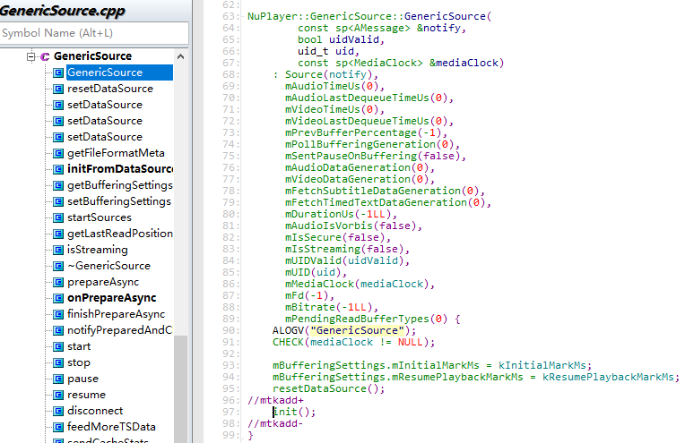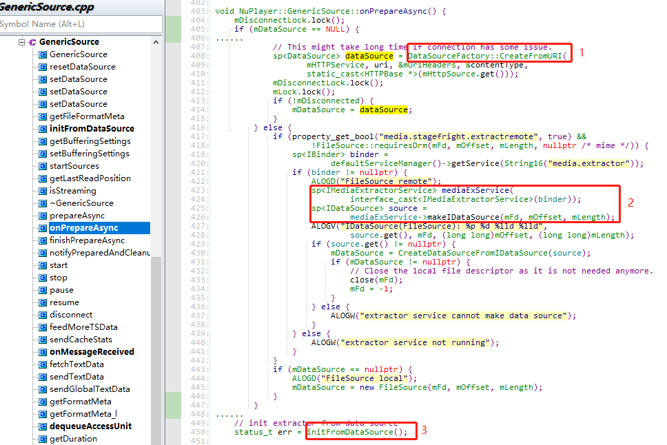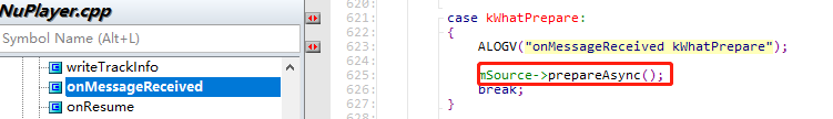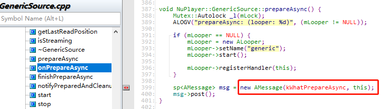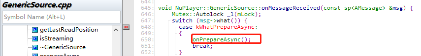 在onMessageReceived中接收到kWhatPrepare的消息后执行mSource->prepareAsync,之前获取到的Source为GenericSource。