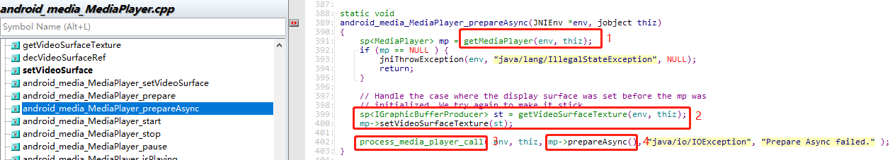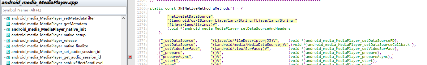 prepareAsync在JNI中的映射为android_media_MediaPlayer_prepareAsync