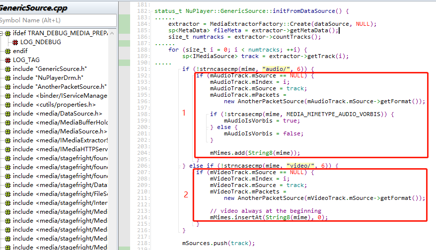 这里出现了三大组件的另外一个MediaExtractor分离器。并且将数据分离开来了,将视频的数据分到mVideoTrack,把音频的分到mAudioTrack。所以上层调用prepare的时候耗时是消耗在这里。他需要分离出数据,解析一部分头信息,一些比较复杂的格式,需要较长的时间。