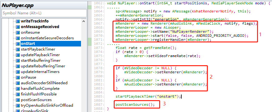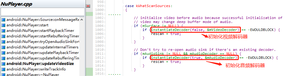 处理消息kWhatScanSources,根据情况初始化音频解码器和视频解码器(需要在audio解码器之前实例化video解码器,因为成功初始化视频解码器可能会改变音频解码器的深度缓冲模式)