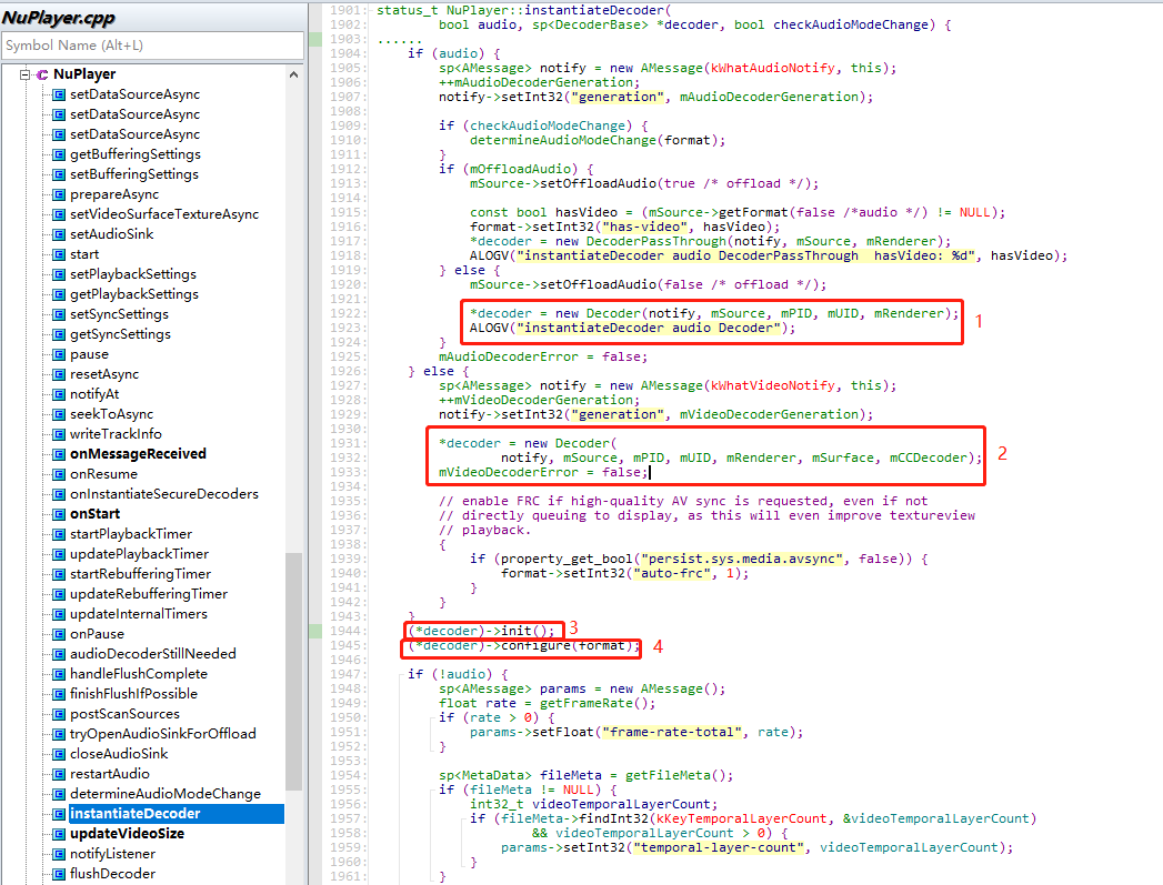 - 对解码器执行init操作,调用NuPlayer::DecoderBase::init为mDecoderLooper注册handler(init()和configure()都是NuPlayerDecoder继承自NuPlayer::DecoderBase的方法)