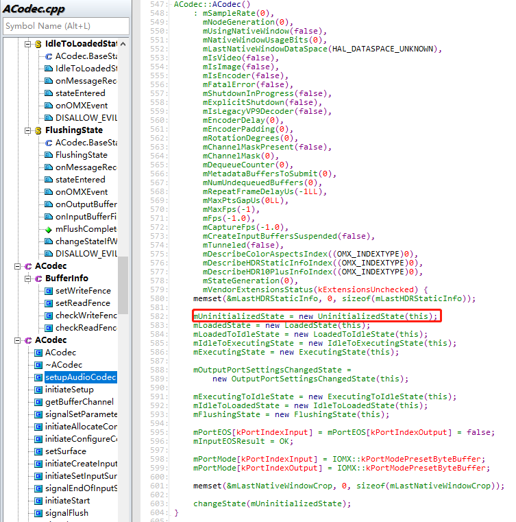 1.在ACodec的构造中将其状态转换为UninitializedState