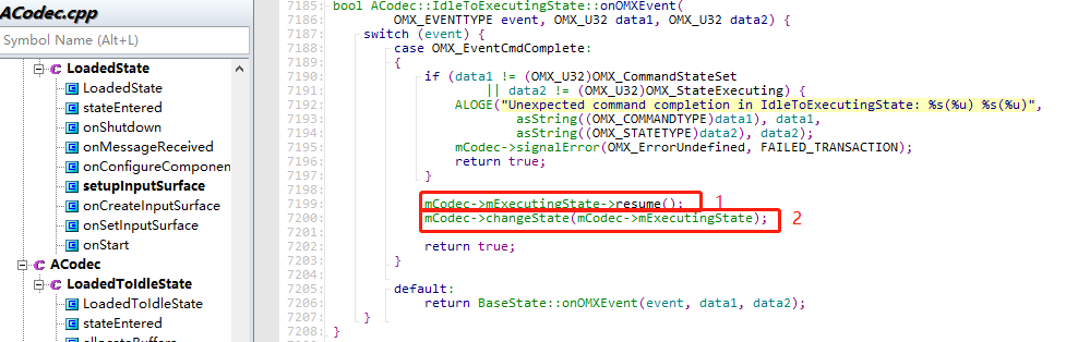 - 接收到组件转换至Idle状态后的OMX_EventCmdComplete事件,会向IOMX发送状态转换命令,经过OMXNodeInstance最终对将OMX组件状态转换成Executing状态(这里OMX会发送OMX_EventCmdComplete事件),然后调用ACodec::ExecutingState::resume
