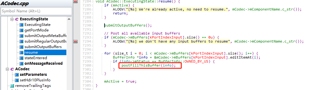 1.在OMX发送OMX_EventCmdComplete事件后会调用到ACodec::ExecutingState::resume函数,在resume中调用ACodec::BaseState::postFillThisBuffer前会先调用函数ACodec::ExecutingState::submitOutputBuffers,即在获取输入数据前会先把输出端的数据提交出去。