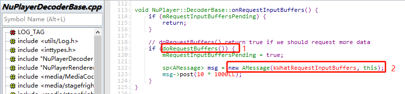 3.调用函数NuPlayer::DecoderBase::onRequestInputBuffers,处理是否需要更多的数据。其中会调用NuPlayer::Decoder::doRequestBuffers,若返回true则需要更多的数据,则会产生新消息kWhatRequestInputBuffers,消息处理中又将调用onRequestInputBuffers。(实际获取更多缓冲的操作在下面ACodec部分完成)