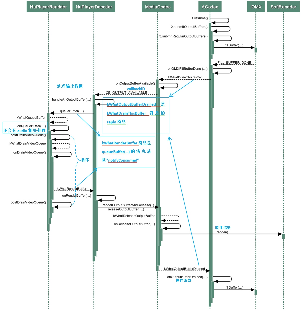c. 在kWhatRenderBuffer消息处理中会调用NuPlayer::Decoder::onRenderBuffer,在其中根据情况调用函数MediaCodec::renderOutputBufferAndRelease渲染并释放,或者调用MediaCodec::releaseOutputBuffer不渲染直接释放,两中情况都会产生kWhatReleaseOutputBuffer消息,该消息处理中调用函数MediaCodec::onReleaseOutputBuffer,其中判断若SoftRenderer非空则进行软件渲染,不然就会通过上面的reply让ACodec去硬件渲染,在kWhatOutputBufferDrained消息处理就会中调用到函数ACodec::BaseState::onOutputBufferDrained进行真正的硬件渲染。
