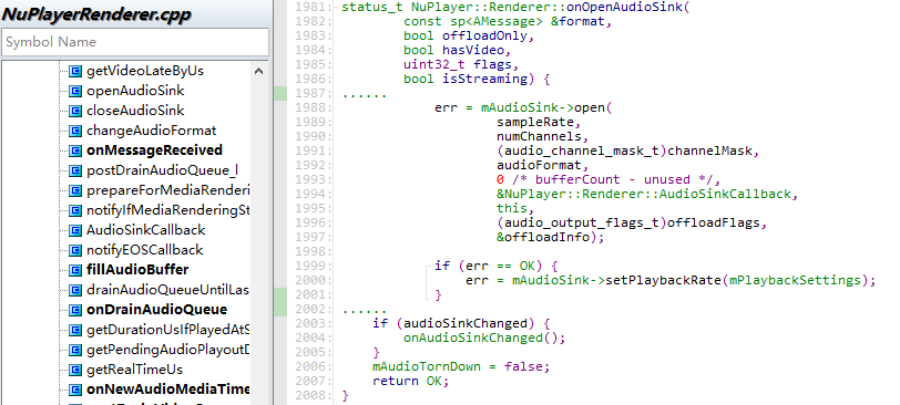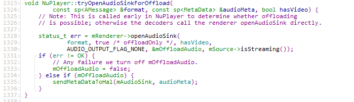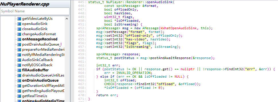 如上消息发往Renderer的子线程NuPlayerRenderer处理,之后调用onOpenAudioSink