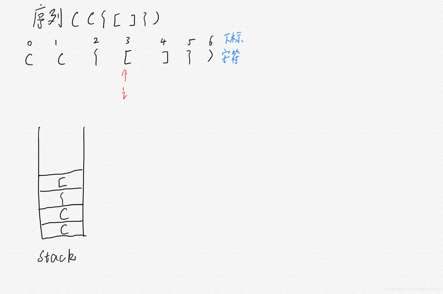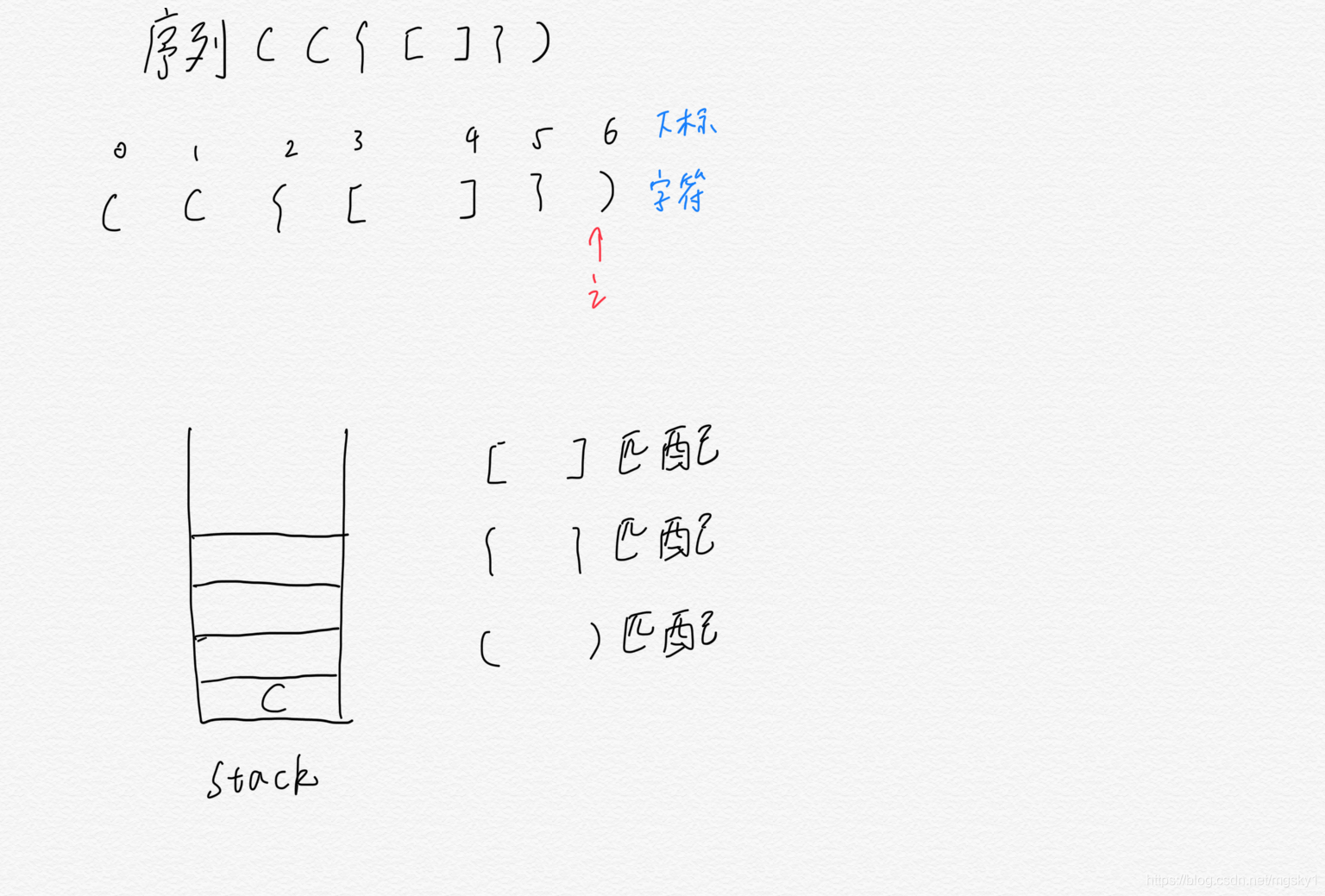 4、遍历到第4个元素]时,发现为右括号,此时,从栈顶出栈一个左括号,即[,刚好[与],匹配成一对
