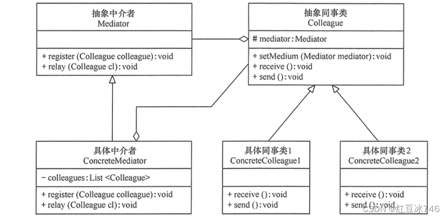 3、抽象同事类(Colleague)角色:定义同事类的接口,保存中介者对象,提供同事对象交互的抽象方法,实现所有相互影响的同事类的公共功能。