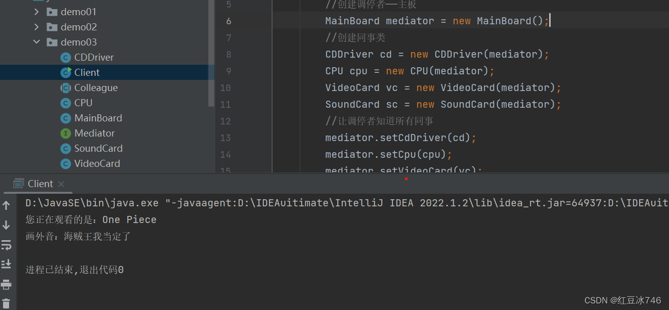 public class Client {public static void main(String[] args) {//创建调停者——主板MainBoard mediator = new MainBoard();//创建同事类CDDriver cd = new CDDriver(mediator);CPU cpu = new CPU(mediator);VideoCard vc = new VideoCard(mediator);SoundCard sc = new SoundCard(mediator);//让调停者知道所有同事mediator.setCdDriver(cd);mediator.setCpu(cpu);mediator.setVideoCard(vc);mediator.setSoundCard(sc);//开始看电影,把光盘放入光驱,光驱开始读盘cd.readCD();}