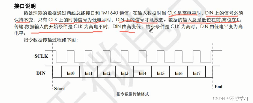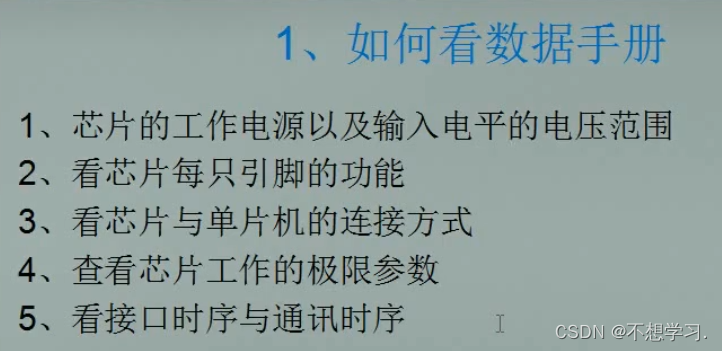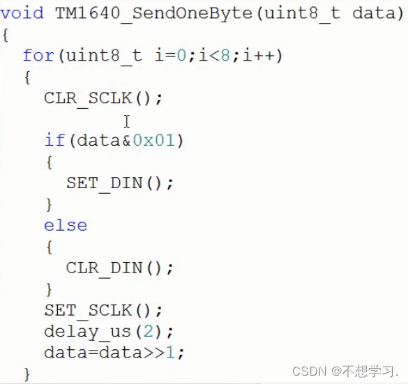 首先我们看数据书册,一共是八个字节,当时钟为低电平的时候,写个if语句,判断最低位为高电平还是低电平,如果为高,数据位写个1,否则写个0,当时钟为高电平的时候数据没有变化,此时是读取数据,延时是给时间让它读,然后传输下数据。最后data数据移位,让下一位变成最低位。
