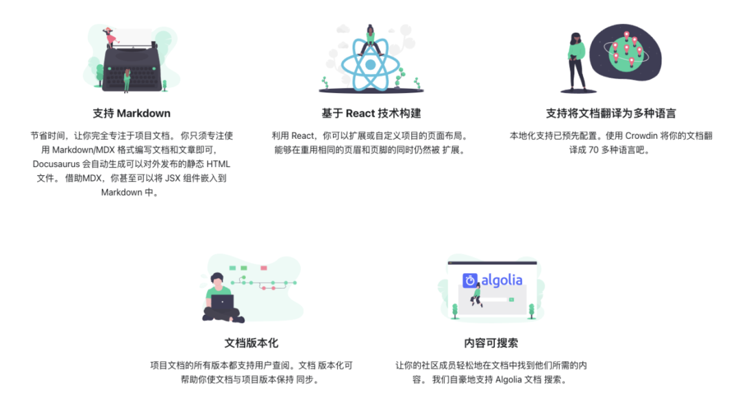 Docusaurus 帮你快速构建并优化网站,让你专注于创作内容。