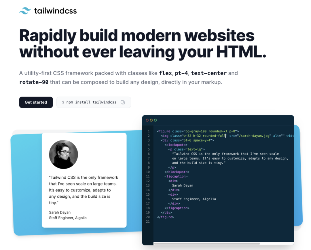 Tailwind CSS 是一个功能类优先的 CSS 框架,它集成了诸如 flex, pt-4, text-center 和 rotate-90 这样的的类,它们能直接在脚本标记语言中组合起来,构建出任何设计。