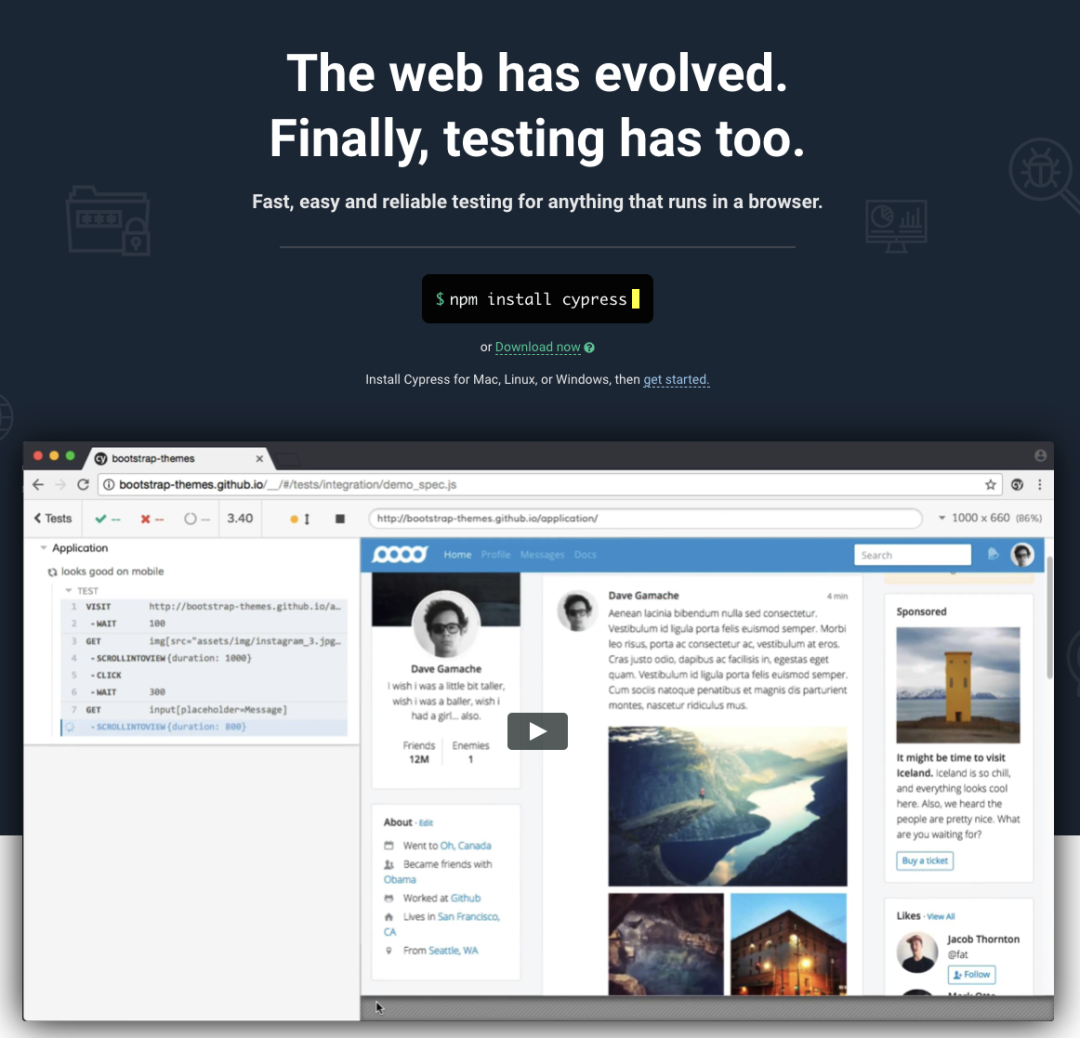 Cypress 简化了设置测试、编写测试、运行测试和调试测试,支持端到端测试、集成测试和单元测试,支持测试在浏览器中运行的任意内容。支持 Mac OS、Linux 和 Windows 平台。
