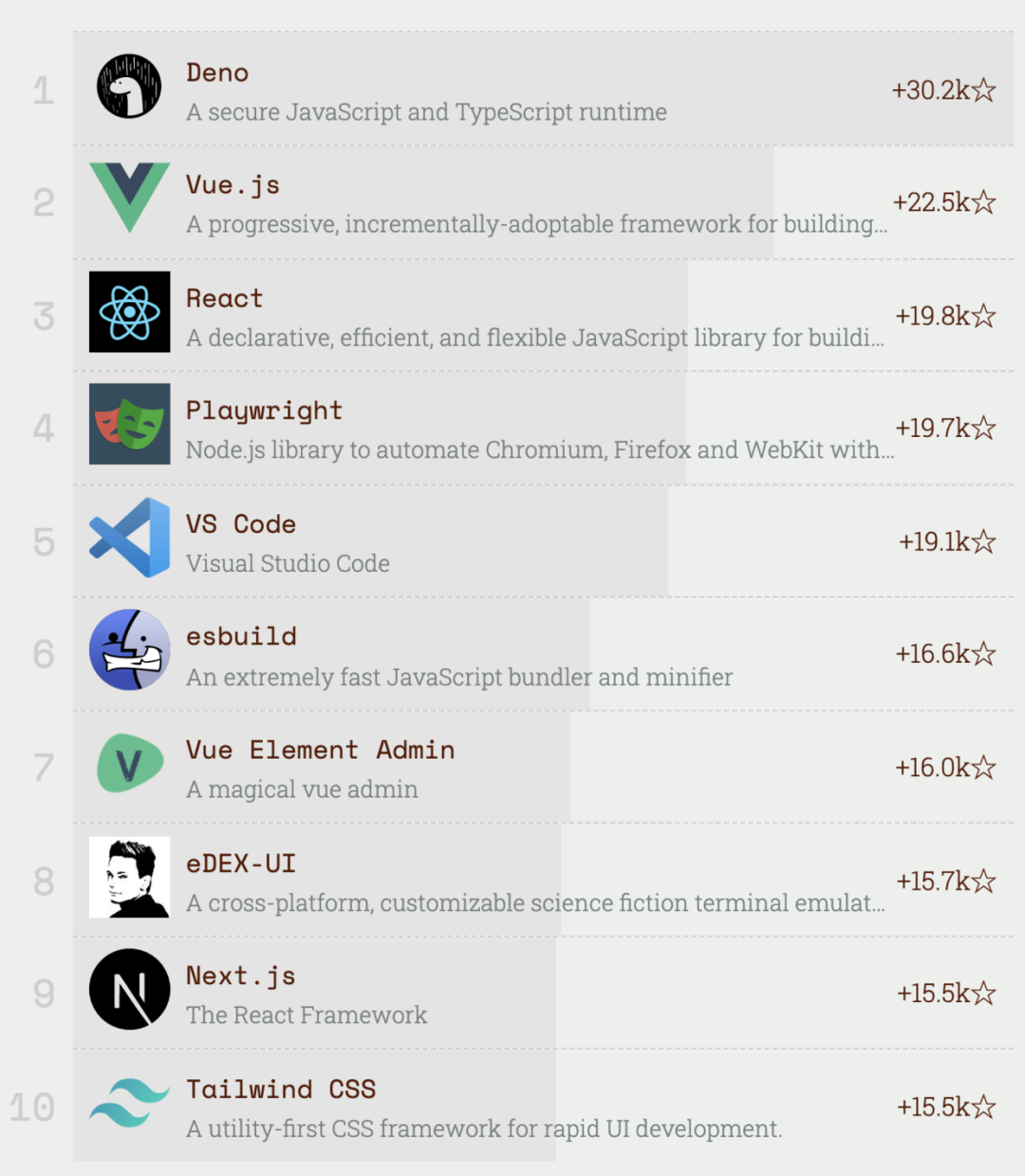 出于多种原因,2020 年是非常特殊的一年。最重要的一个:5 年以来的第一次,新星的总冠军不是 Vue.js,而是 Deno……真是令人惊讶!