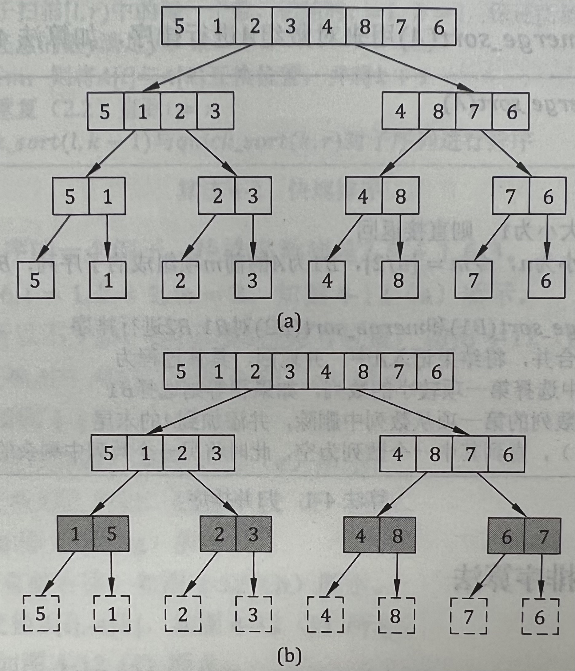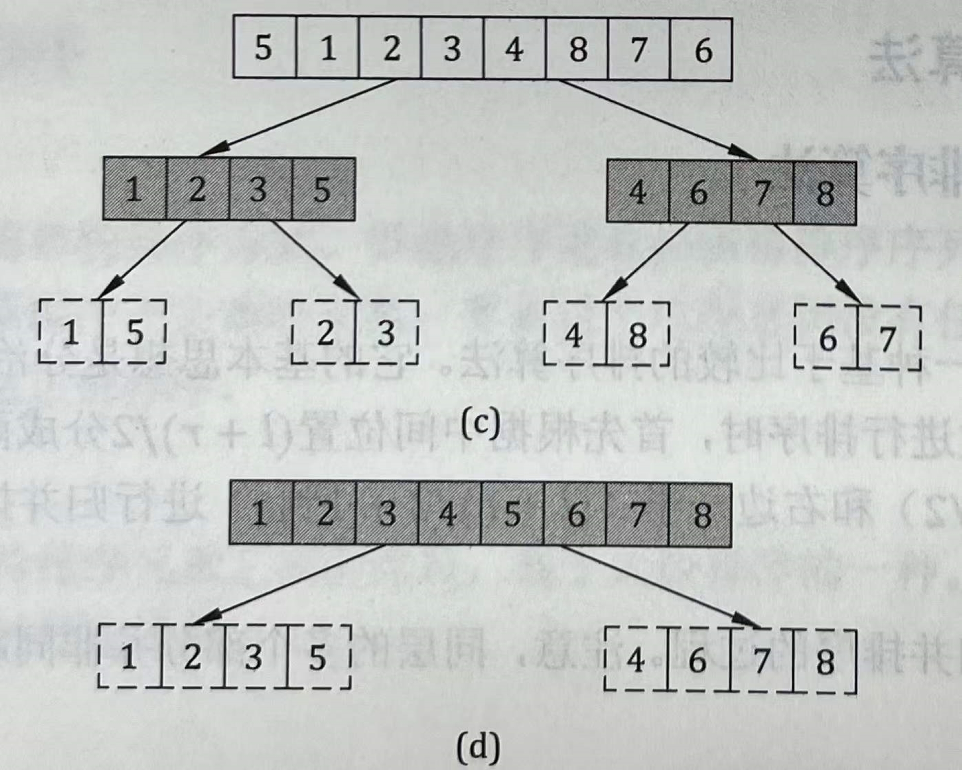 void merge_sort(int *array,int l,int r){if(l>=r) return;int mid=l+r>>1;//>>1 为二进制右移运算符merge_sort(array,l,mid);merge_sort(array,mid+1,r);int x=0,m=l,n=mid+1;while(m<=mid && n<= r){if(array[m] <= array[n]){tmp[x++] = array[m++];}else{tmp[x++] = array[n++];} }while(m <= mid) tmp[x++]=array[m++];while(n <= r) tmp[x++]=array[n++];for(m=l,n=0;m<=r;m++,n++) array[m]=tmp[n];