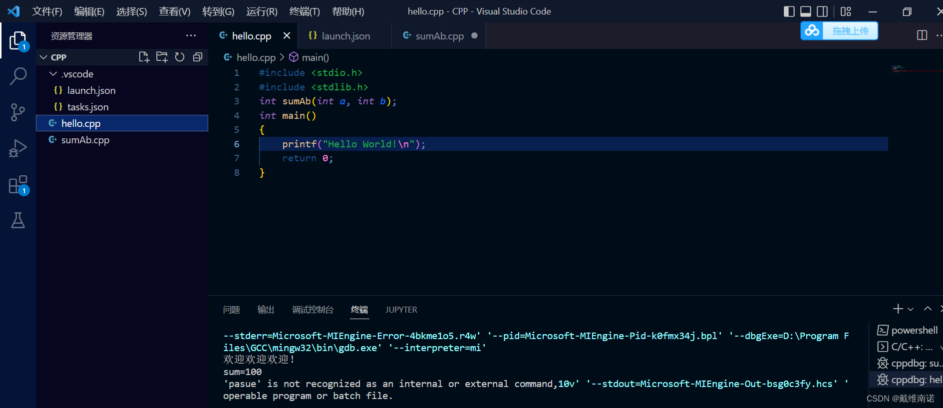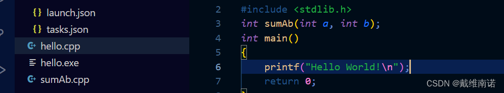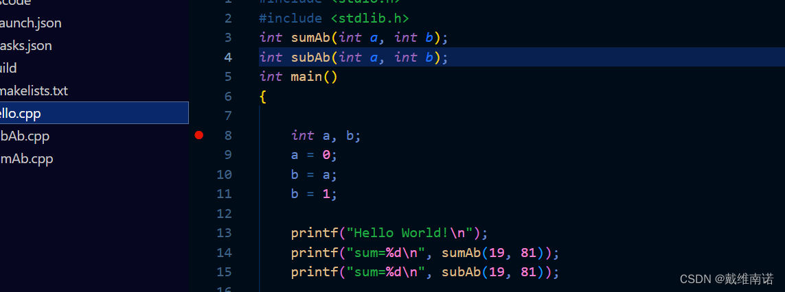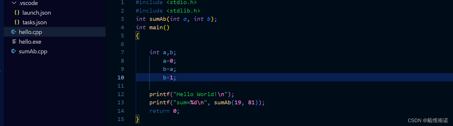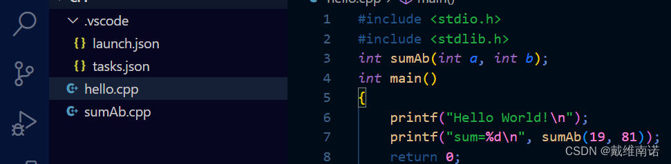比如我们之前的内容上再编辑一个源文件函数:sumAb.cpp