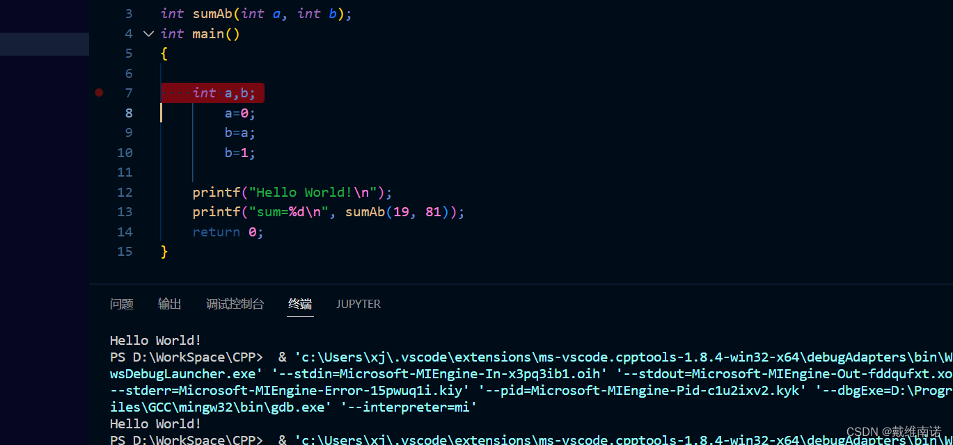 在hello.cpp开头添加函数声明: