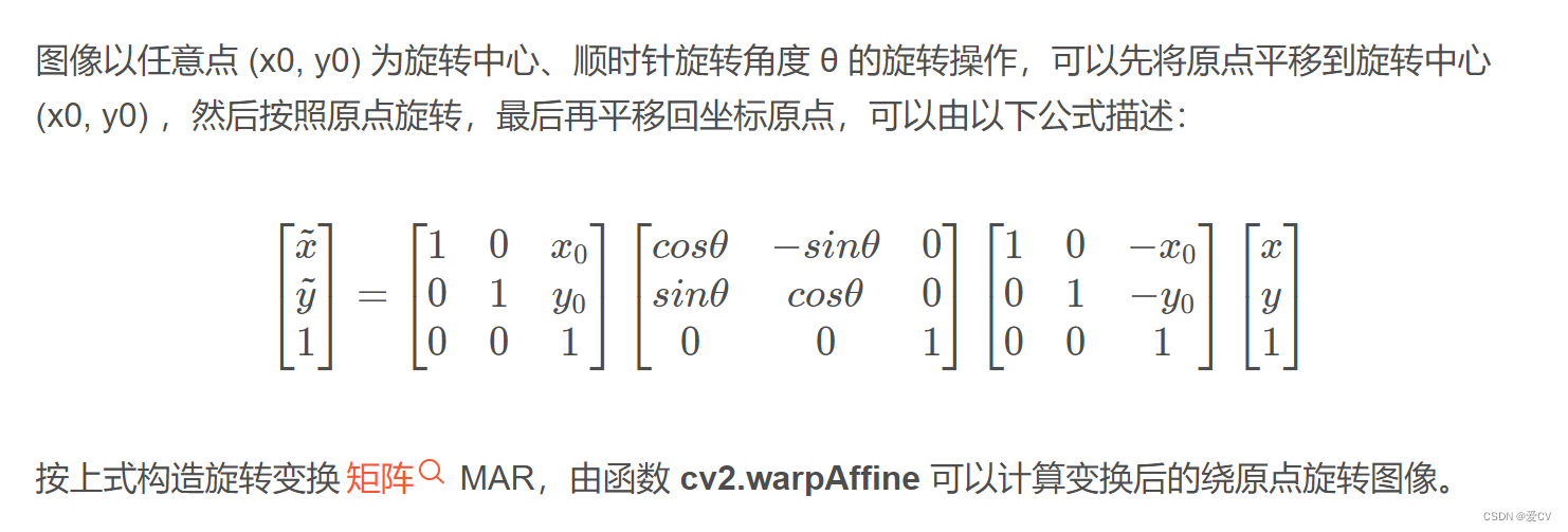 图像的旋转具体实现分为两步:先根据旋转角度和旋转中心获取旋转矩阵(通常采用RotatedRect函数获得);然后根据旋转矩阵进行仿射变换,即可实现任意角度和任意中心的旋转效果。旋转矩阵的形式如下: