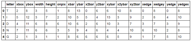 上表中反映了手体字母数据集的前5行观测,都是关于手写体的长、宽及坐标信息特征。通常在建模前都需要将原始数据集拆分为两个部分,分别用于模型的构建和测试,具体代码如下: