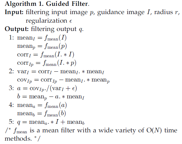 3、最重要的优点,快,效率高,时间复杂度为O(N),N是像素个数,也就是说与掩膜窗口尺寸无关了,我们知道传统双边滤波效率是很低的。还有更快的Fast Guide Filter:https://arxiv.org/abs/1505.00996
