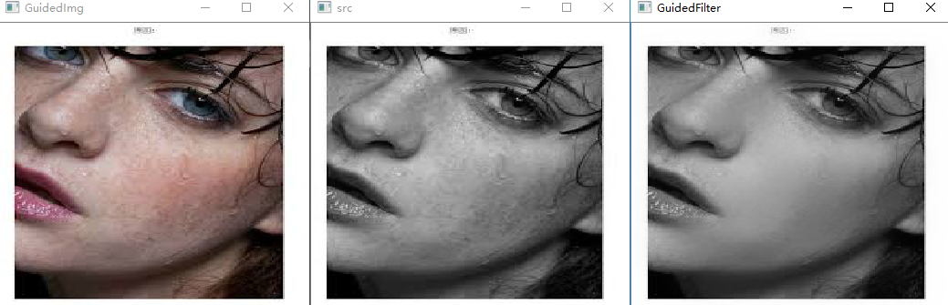 }int main(){cv::Mat I = cv::imread("I:\\Learning-and-Practice\\2019Change\\Image process algorithm\\Img\\woman1.jpeg");cv::Mat P = cv::imread("I:\\Learning-and-Practice\\2019Change\\Image process algorithm\\Img\\woman1.jpeg");if (I.empty() || P.empty()){return -1;}if (P.channels() > 1)cv::cvtColor(P, P, CV_RGB2GRAY);//自编GuidedFilter测试double t2 = (double)cv::getTickCount(); //测时间cv::Mat q;q = GuidedFilter_Color(I, P, 9, 0.2*0.2);t2 = (double)cv::getTickCount() - t2;double time2 = (t2 *1000.) / ((double)cv::getTickFrequency());std::cout << "MyGuidedFilter_process=" << time2 << " ms. " << std::endl << std::endl;cv::namedWindow("GuidedImg");cv::imshow("GuidedImg", I);cv::namedWindow("src");cv::imshow("src", P);cv::namedWindow("GuidedFilter", CV_WINDOW_NORMAL);cv::imshow("GuidedFilter", q);cv::waitKey(0);}