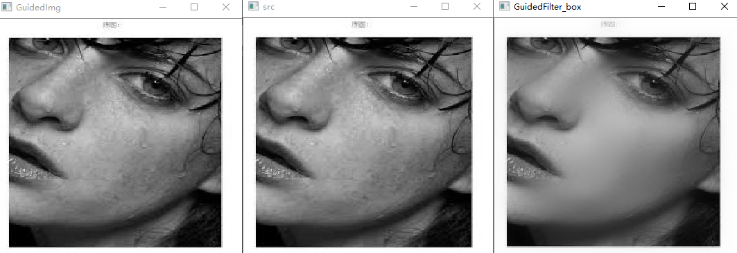 cv::Mat GuidedFilter(cv::Mat& I, cv::Mat& p, int r, double eps){int wsize = 2 * r + 1;//数据类型转换I.convertTo(I, CV_64F, 1.0 / 255.0);p.convertTo(p, CV_64F, 1.0 / 255.0);//meanI=fmean(I)cv::Mat mean_I;cv::boxFilter(I, mean_I, -1, cv::Size(wsize, wsize), cv::Point(-1, -1), true, cv::BORDER_REFLECT);//盒子滤波//meanP=fmean(P)cv::Mat mean_p;cv::boxFilter(p, mean_p, -1, cv::Size(wsize, wsize), cv::Point(-1, -1), true, cv::BORDER_REFLECT);//盒子滤波//corrI=fmean(I.*I)cv::Mat mean_II;mean_II = I.mul(I);cv::boxFilter(mean_II, mean_II, -1, cv::Size(wsize, wsize), cv::Point(-1, -1), true, cv::BORDER_REFLECT);//盒子滤波//corrIp=fmean(I.*p)cv::Mat mean_Ip;mean_Ip = I.mul(p);cv::boxFilter(mean_Ip, mean_Ip, -1, cv::Size(wsize, wsize), cv::Point(-1, -1), true, cv::BORDER_REFLECT);//盒子滤波//varI=corrI-meanI.*meanIcv::Mat var_I, mean_mul_I;mean_mul_I=mean_I.mul(mean_I);cv::subtract(mean_II, mean_mul_I, var_I);//covIp=corrIp-meanI.*meanpcv::Mat cov_Ip;cv::subtract(mean_Ip, mean_I.mul(mean_p), cov_Ip);//a=conIp./(varI+eps)//b=meanp-a.*meanIcv::Mat a, b;cv::divide(cov_Ip, (var_I+eps),a);cv::subtract(mean_p, a.mul(mean_I), b);//meana=fmean(a)//meanb=fmean(b)cv::Mat mean_a, mean_b;cv::boxFilter(a, mean_a, -1, cv::Size(wsize, wsize), cv::Point(-1, -1), true, cv::BORDER_REFLECT);//盒子滤波cv::boxFilter(b, mean_b, -1, cv::Size(wsize, wsize), cv::Point(-1, -1), true, cv::BORDER_REFLECT);//盒子滤波//q=meana.*I+meanbcv::Mat q;q = mean_a.mul(I) + mean_b;//数据类型转换I.convertTo(I, CV_8U, 255);p.convertTo(p, CV_8U, 255);q.convertTo(q, CV_8U, 255);return q;}int main(){cv::Mat src = cv::imread("I:\\Learning-and-Practice\\2019Change\\Image process algorithm\\Img\\woman.jpg");if (src.empty()){return -1;}//if (src.channels() > 1) // cv::cvtColor(src, src, CV_RGB2GRAY);//自编GuidedFilter测试double t2 = (double)cv::getTickCount(); //测时间cv::Mat dst1, src_input, I;src.copyTo(src_input);if (src.channels() > 1)cv::cvtColor(src, I, CV_RGB2GRAY); //若引导图为彩色图,则转为灰度图std::vector p,q;if (src.channels() > 1){ //输入为彩色图cv::split(src_input, p);for (int i = 0; i < src.channels(); ++i){dst1 = GuidedFilter(I, p[i], 9, 0.1*0.1);q.push_back(dst1);}cv::merge(q, dst1);}else{ //输入为灰度图src.copyTo(I);dst1 = GuidedFilter(I, src_input, 9, 0.1*0.1);}t2 = (double)cv::getTickCount() - t2;double time2 = (t2 *1000.) / ((double)cv::getTickFrequency());std::cout << "MyGuidedFilter_process=" << time2 << " ms. " << std::endl << std::endl;cv::namedWindow("GuidedImg", CV_WINDOW_NORMAL);cv::imshow("GuidedImg", I);cv::namedWindow("src", CV_WINDOW_NORMAL);cv::imshow("src", src);cv::namedWindow("GuidedFilter_box", CV_WINDOW_NORMAL);cv::imshow("GuidedFilter_box", dst1);cv::waitKey(0);}