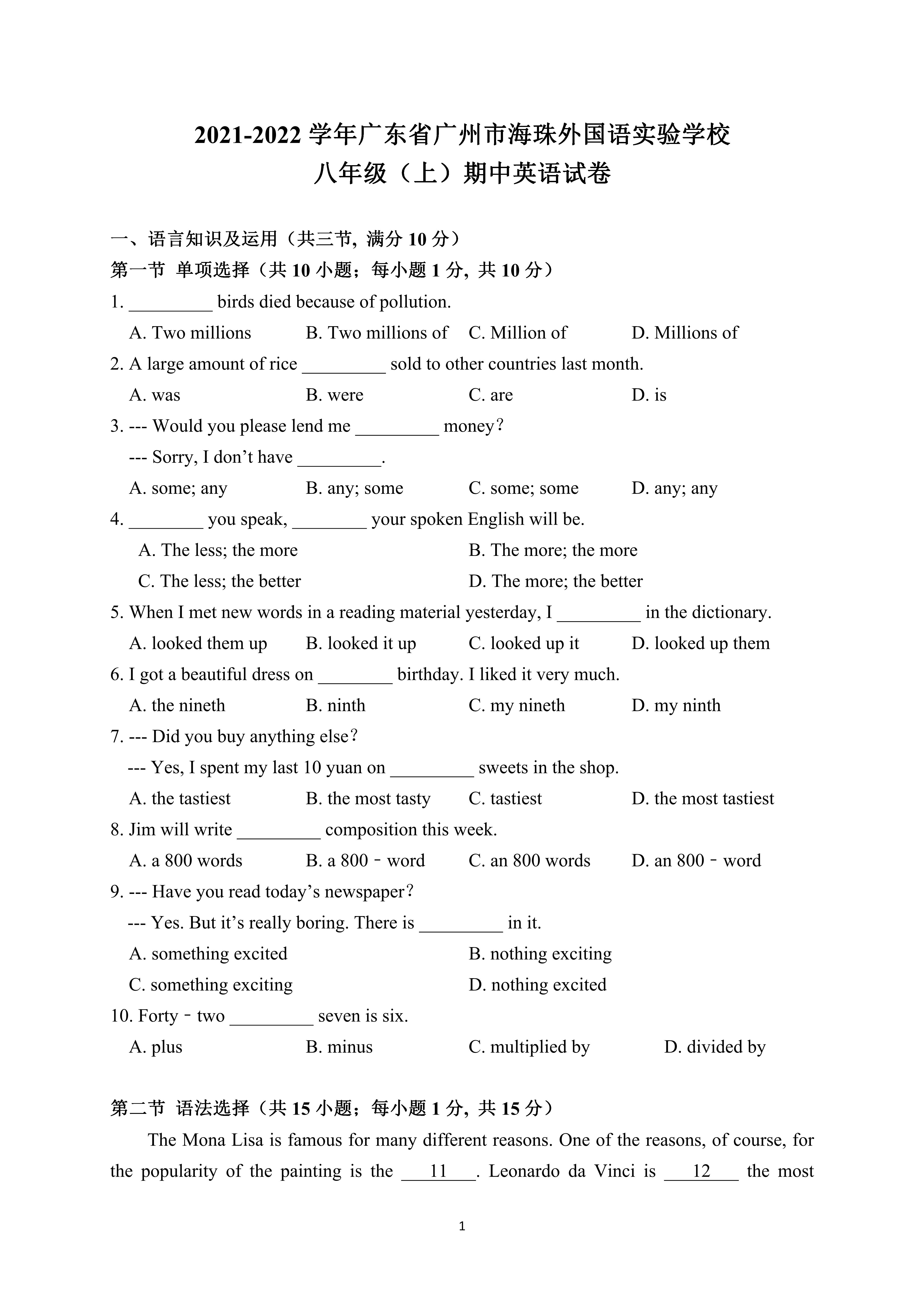 2021-2022学年广州市海珠外国语实验学校八年级第一学期期中英语试题