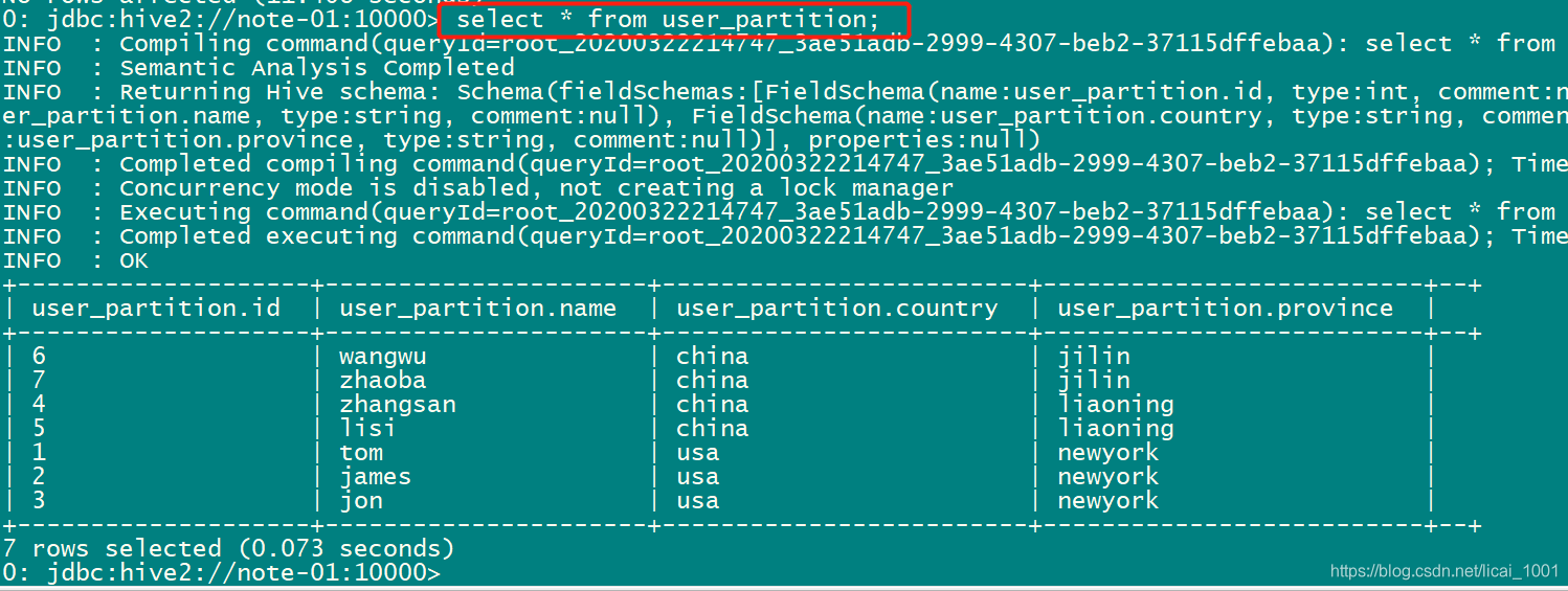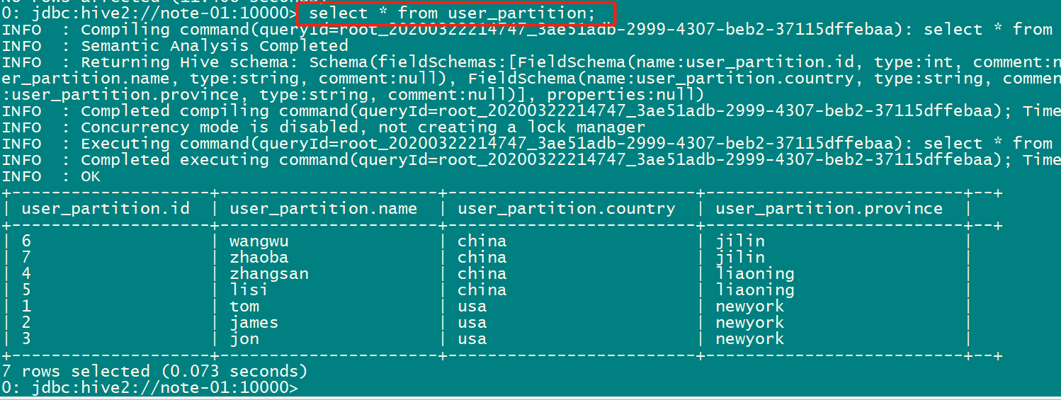 select id,name from user_tmp where country='china' and province='liaoning';-- 查询静态分区表内容